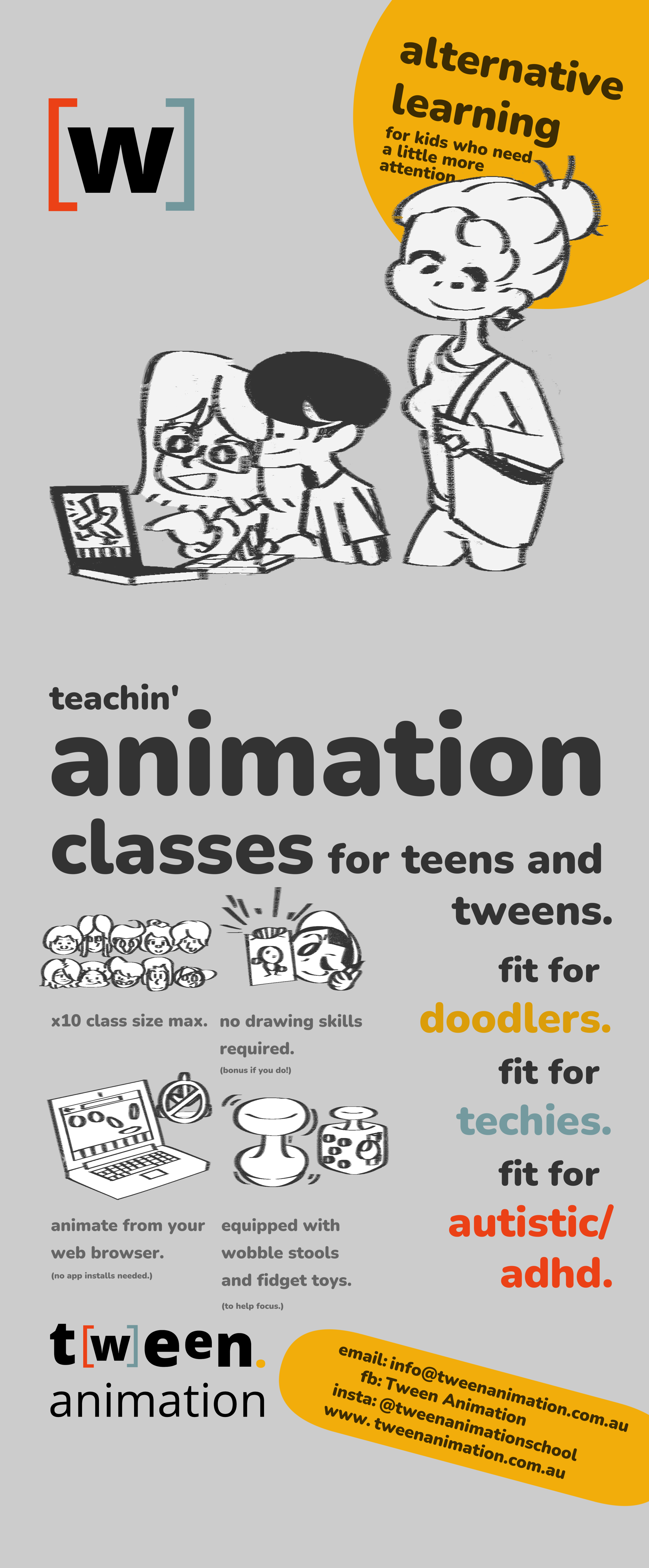illustrations made for autistic/adhd-friendly animation tutoring business ran by me, featured on website, social media and various branding.